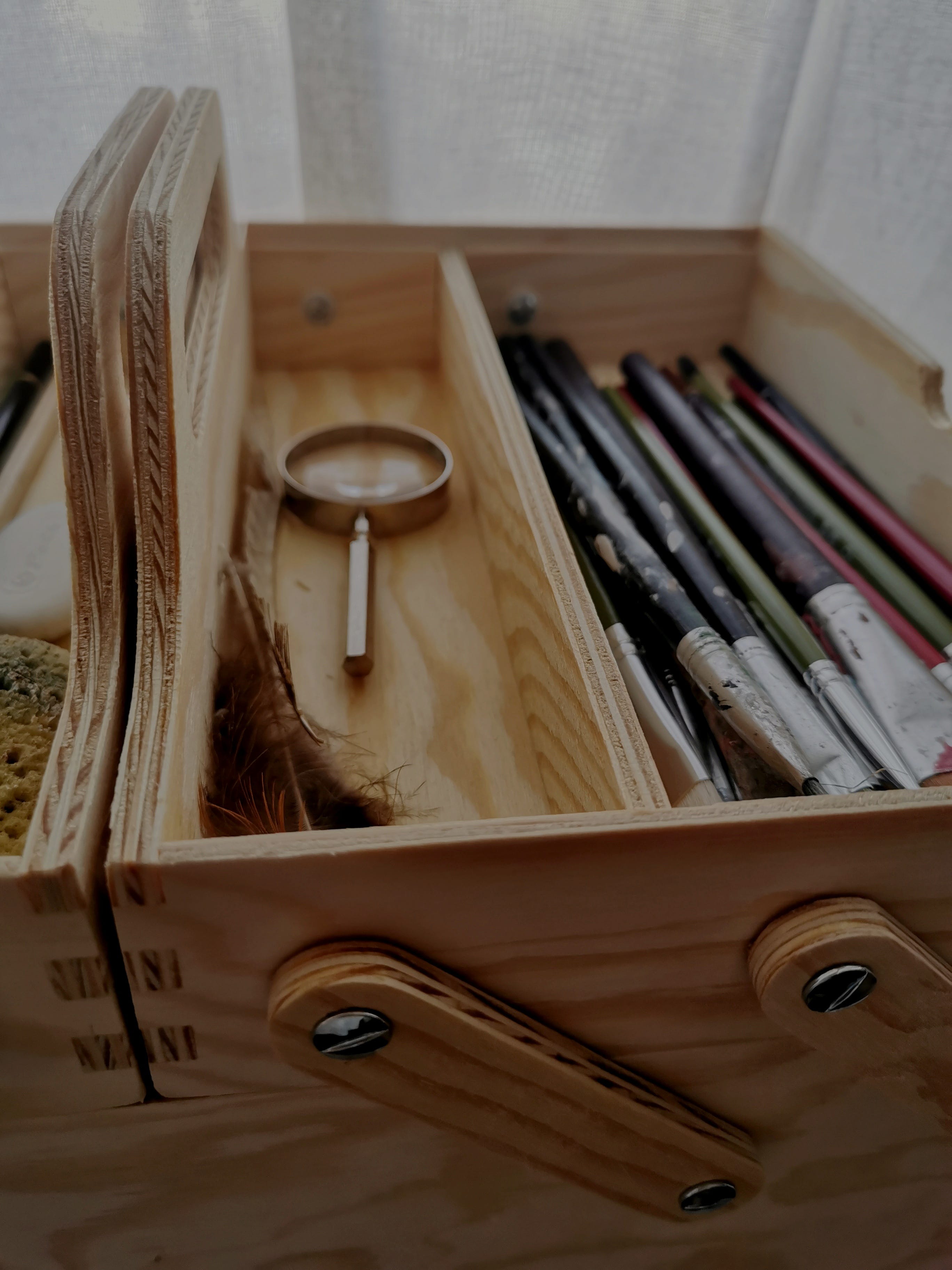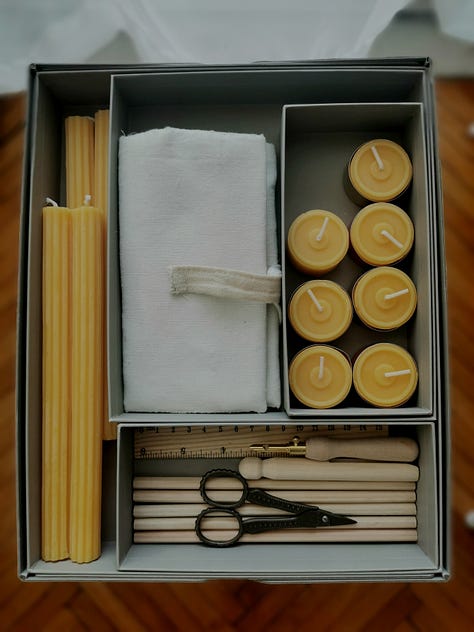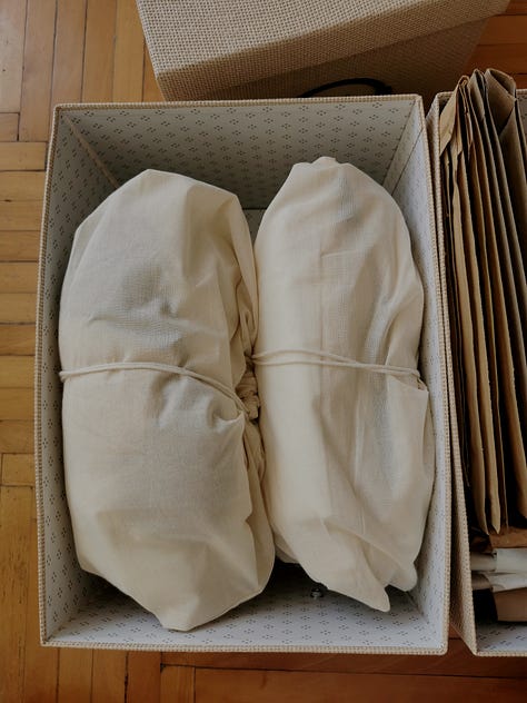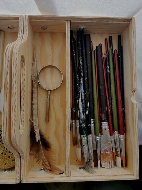 This time of year is naturally reflective for me. October is my favorite month and somehow it always calls me to create, to walk, to read, to be present more then ever. To reflect on my life, my way of living. I look back on what’s been and consider what’s to come. I am often in my decluttering mode in October too. So this month I decided it is time for creating even simpler home. I decided to clear out all the clothes, donate everything we don't wear and, unfortunately, throw away everything that is irreparable. I have two large shelves in the hallway where I store gift wrapping material, Christmas decorations, books I've read and want to keep, painting and embroidery supplies. Until now, it was all sorted in ordinary cardboard boxes, but this month I decided to order some nice boxes with inscriptions for each content, to carefully inspect, clear and organize everything. So each box got its contents and finally my shelves were organized and even beautiful to look at. Fabrics stored in sewn satchels and stored in one box. Embroidery threads sorted by color. My beeswax candles, pencils, scissors, needles; all arranged in boxes and their tiny compartments. I finally found the perfect wooden box for my painting supplies. It's actually a toolbox, but it seemed perfect for my painting supplies. It really is. Finally everything has its own place. But I'm still waiting for the right time to continue painting my illustrations. For now, that wooden box full of brushes, paints and feathers from our walks will be waiting on the shelf for a while, waiting for the time when I will find moments just for brush strokes and my canvas.