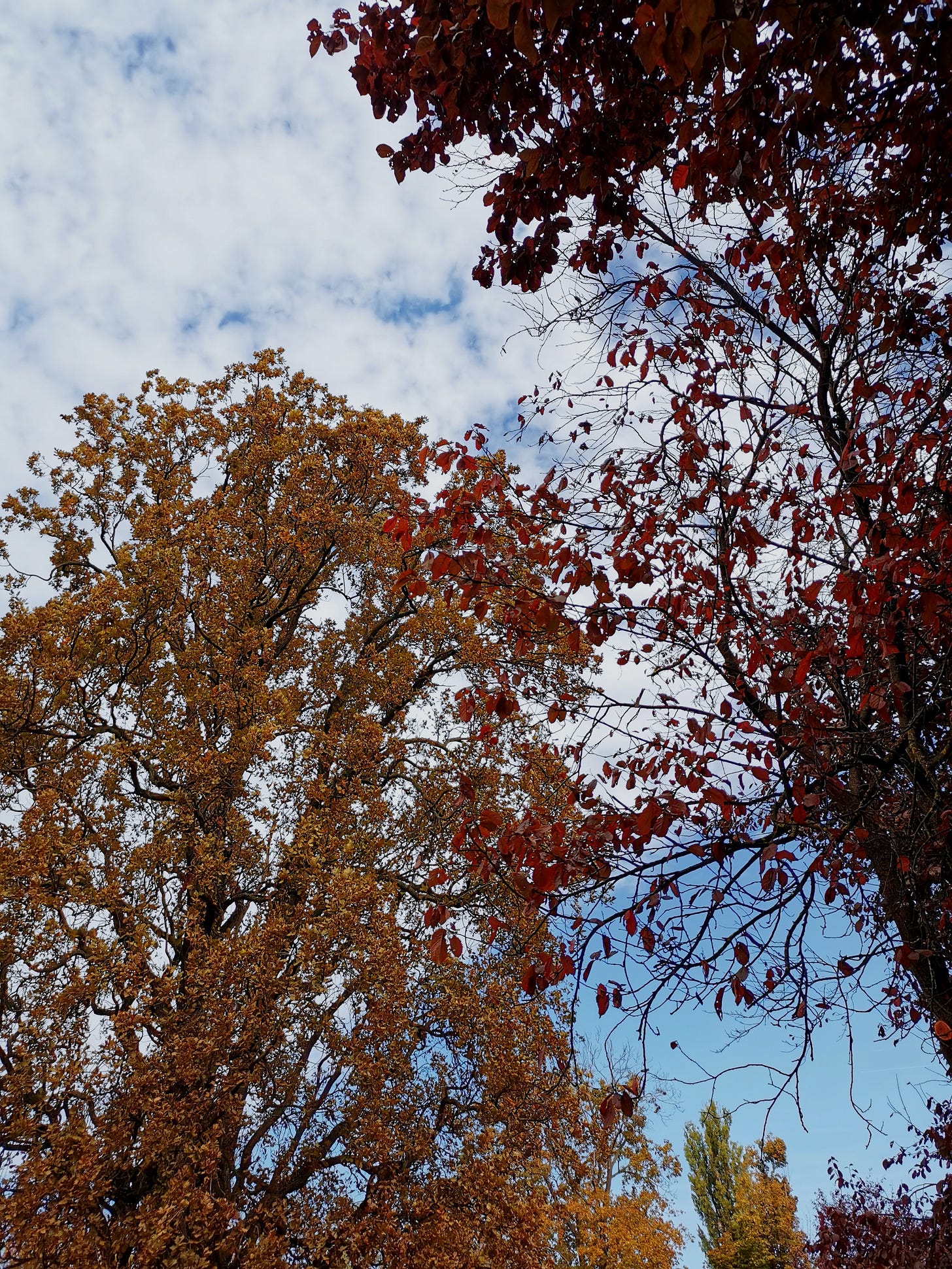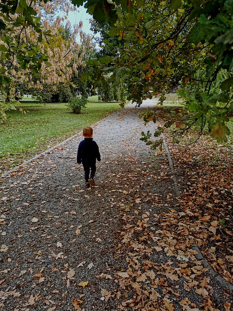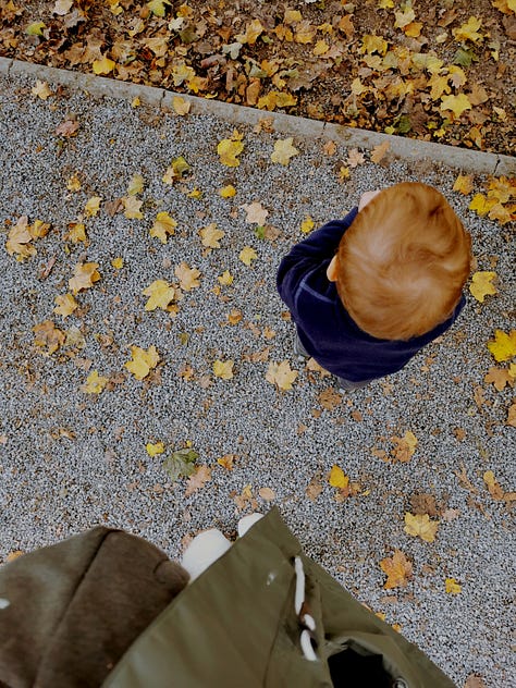 In October I went for a morning walk almost everyday with my newborn and my toddler. Everywhere around us, leaves brown, dark yellow and auburn. My little boy loves to walk through piles of leaves and just listen to that crisp sound under his feet. We have spent at last two to three hours in that morning walk. Sometimes we are walking along the riverbank. It is my favorite place for walks. During autumn, the river is gloomy, turbulent, but somehow miraculously quiet. The sand is dark, wet and heavy under our feet. Here and there a piece of wood, branches, bird's feathers floating down the river. While the city stretches across the river, we gladly look to our side, where the forest stretches next to river. Forest that is now already wreathed in all those autumn shades and sounds. In the morning and in the early evening, crows fly very loudly and hurriedly in flocks over the moody sky. From tree to tree. From branch to branch. That place with deep and dark water, forest sounds and wet sand somehow always brings peace to my soul. Silence of my mind. Ease of my mind. Presence to the moment. Other mornings we were spending time in the park surrounded by groves of tall trees. My little one and I love to lift our heads and walk along those little stone paths while looking at those treetops. We always laugh and talk about how we feel like we're up in those majestic branches. Flying among them. Is there anything more beautiful than watching a child carefree rustling through the autumn leaves, imagining, talking and building his little happiness?