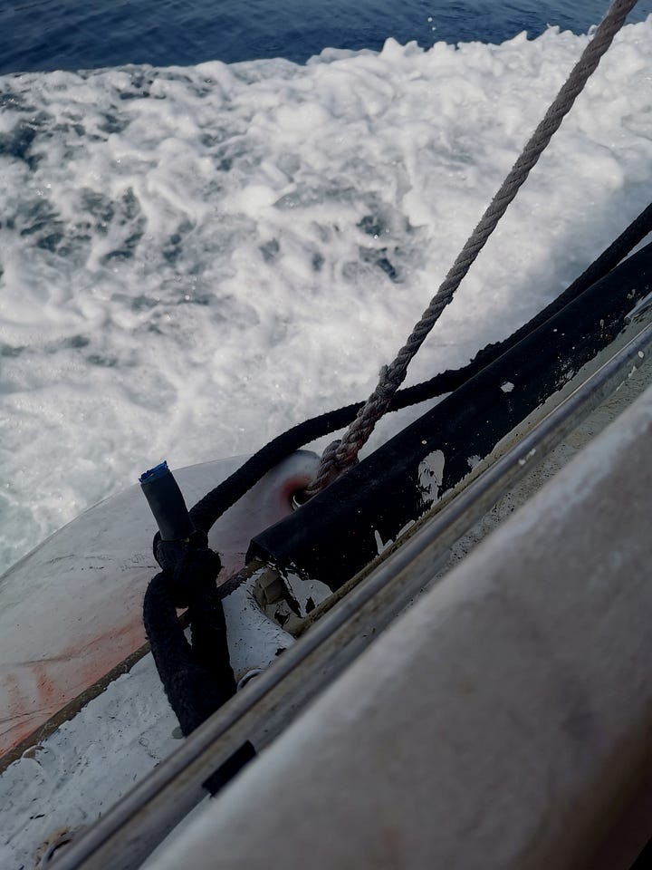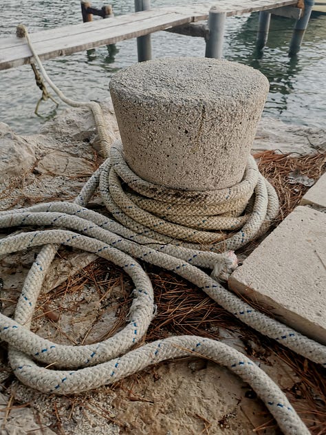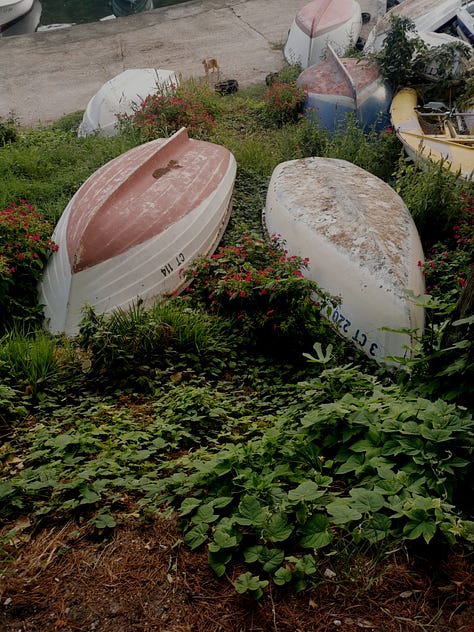 Our walking rhythm here is calm and quiet, we often stop and curiously observe the night waves and circles in the water while throwing pebbles. Here and there we hear crickets, we seek the sound of boat arrivals and departures and the clapping of oars on the shore as they hang from the abandoned little red boat. We walk on wooden docks and admire the beauty of ropes tied to small concrete pillars.
